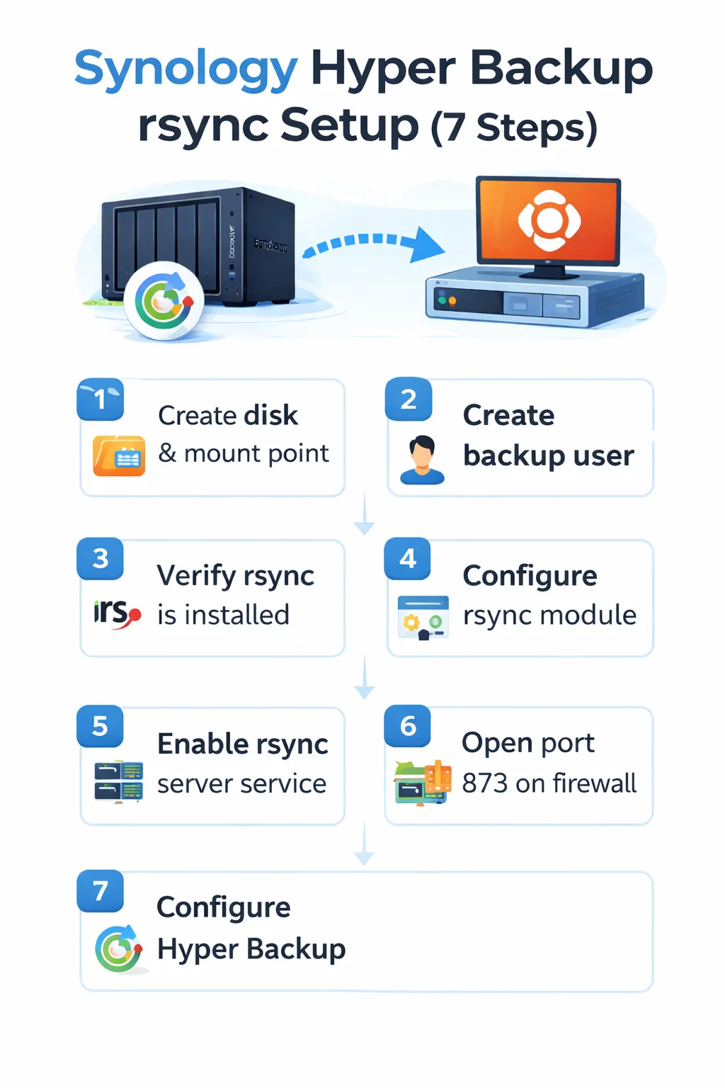 To use Synology Hyper Backup with an Ubuntu rsync server, I had to create a dedicated backup path, create a user with access to that folder, and configure an rsync module in rsyncd.conf, enable the rsync service, open port 873 on the firewall, and then connect from Hyper Backup using the server type “rsync-compatible server.” SSH access alone was not enough in my case.
